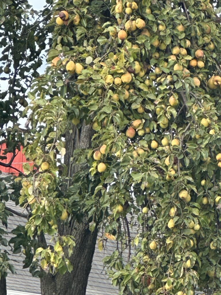 About halfway through my 13-mile day, in front of a farmhouse, I admire the two most spectacular pear trees I’ve ever seen. I’m tempted to stop and ask if I can have a couple, but don’t, and later regret it.