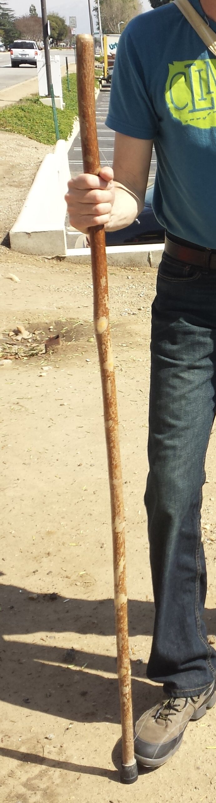 Ah, my walking stick. It’s seen about 10,000 miles of action and serves so many purposes. It propels me up hills. It eases the impact on my legs when going down hills. It gives me balance on rough terrain. It flings dead animals off the roadway.